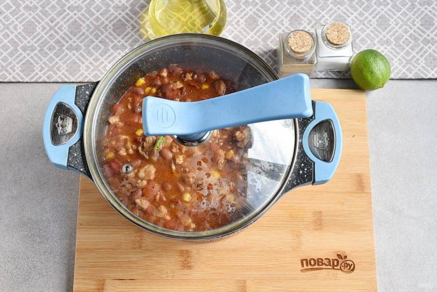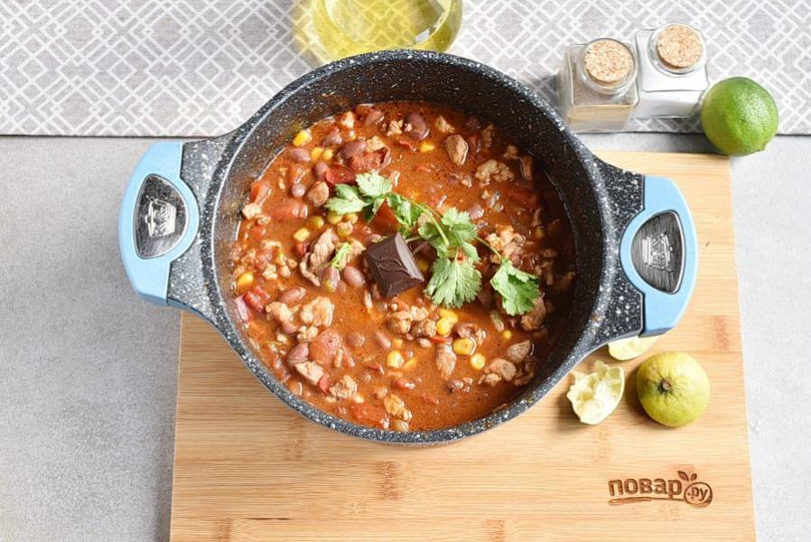 Добавьте шоколад и немного рубленой кинзы. Выжмите сок половинки небольшого лайма. Перемешайте и отключите нагрев.
