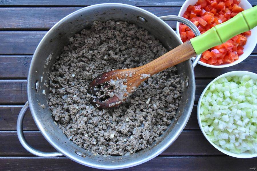 В кастрюлю переложите подготовленный говяжий фарш и обжарьте его, периодически перемешивая.