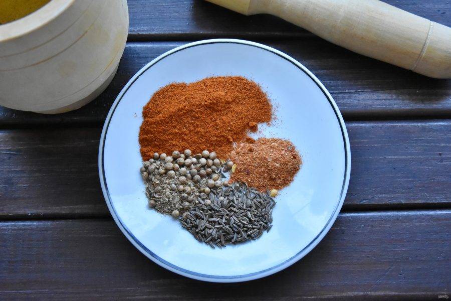 В ступке смешайте специи: хлопья острого перца, тмин, кориандр, паприку и соль. Разотрите смесь пестиком.