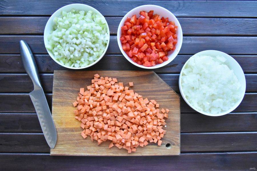 Подготовьте овощи. Стебли сельдерея освободите от грубых волокон. Болгарский перец очистите от сердцевины с семенами. Нарежьте лук, сельдерей, морковь и болгарский перец небольшим кубиком одинакового размера. Чеснок и перец острый измельчите.