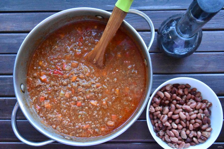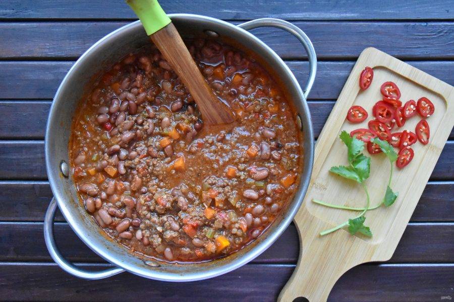 Влейте в чили томатный соус или густой домашний томатный сок. Одновременно влейте бульон или воду. Если томатный сок кажется вам кислым, для корректировки вкуса размешайте в бульоне 1 ст.л. меда. Накройте кастрюлю крышкой и на медленном огне тушите 1,5-2 часа. На последнем этапе приготовления добавьте консервированную красную фасоль.