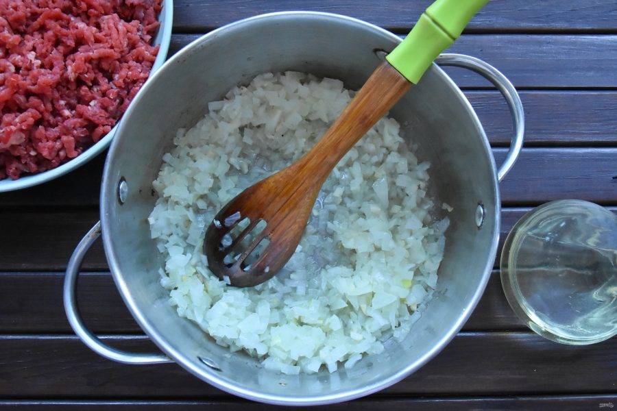 Для приготовления "Чили кон карне" подготовьте глубокую кастрюлю. Разогрейте посуду, влейте растительное масло, добавьте репчатый лук и чеснок. Пассеруйте лук до прозрачности и мягкости на среднем огне.