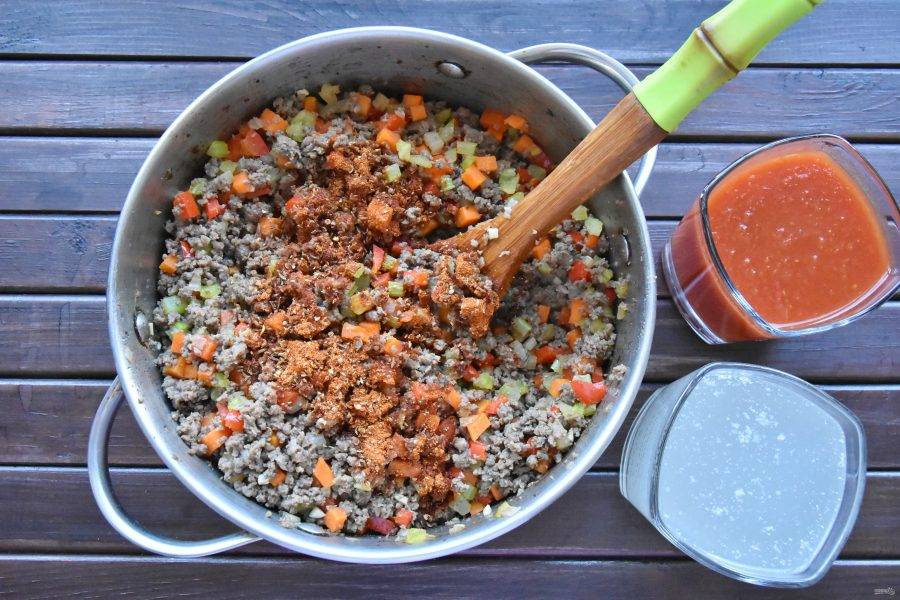 К обжаренному фаршу добавьте подготовленные овощи. Перемешайте и обжариваете минут 5-6. Всыпьте смесь специй с солью.