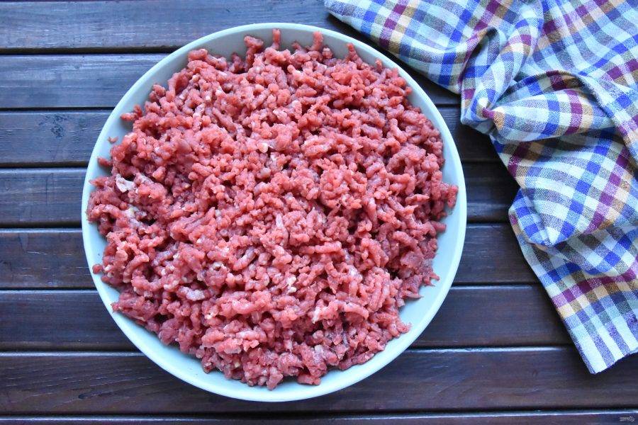 Мясо освободите от кости и соединительной ткани. Нарежьте говядину на куски, промойте, просушите и перекрутите на мясорубке.