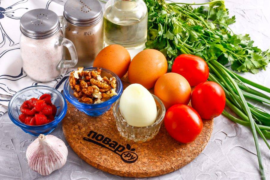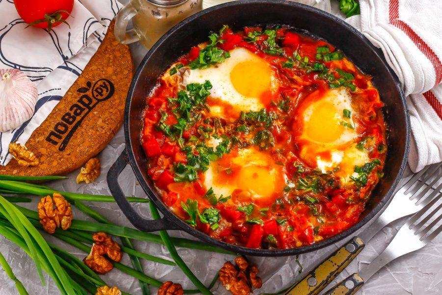 Яичница по-грузински — пряная, сочная, красочная и очень вкусная. Ее готовят примерно 15-20 минут до того состояния, когда белки куриных яиц в соусе становятся плотными, а желтки остаются жидкими.
