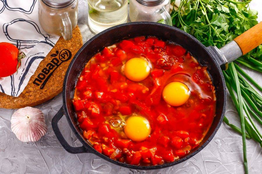 Затем сделайте в соусе углубления и вбейте в них по куриному яйцу. Можно заменить куриные яйца перепелиными.
