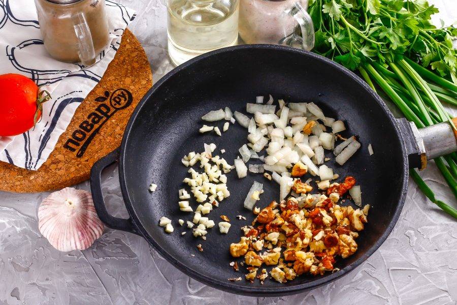 Туда же добавьте луковую нарезку, растительное масло, измельчите в руках ядра грецких орехов. Обжарьте примерно 3 минуты.
