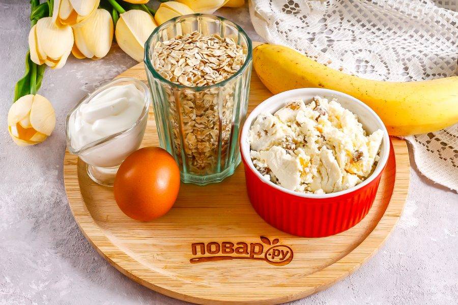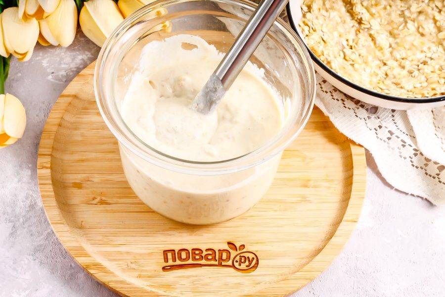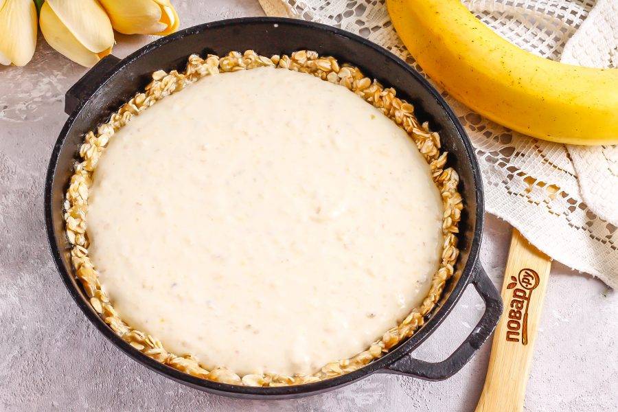 Всыпьте в банановую массу овсяные хлопья и размешайте. Оставьте на 10-15 минут для набухания.