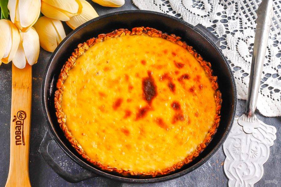 Вылейте в середину творожную массу. Диаметр формы — 22 см. Поместите форму в духовку на 40-45 минут.