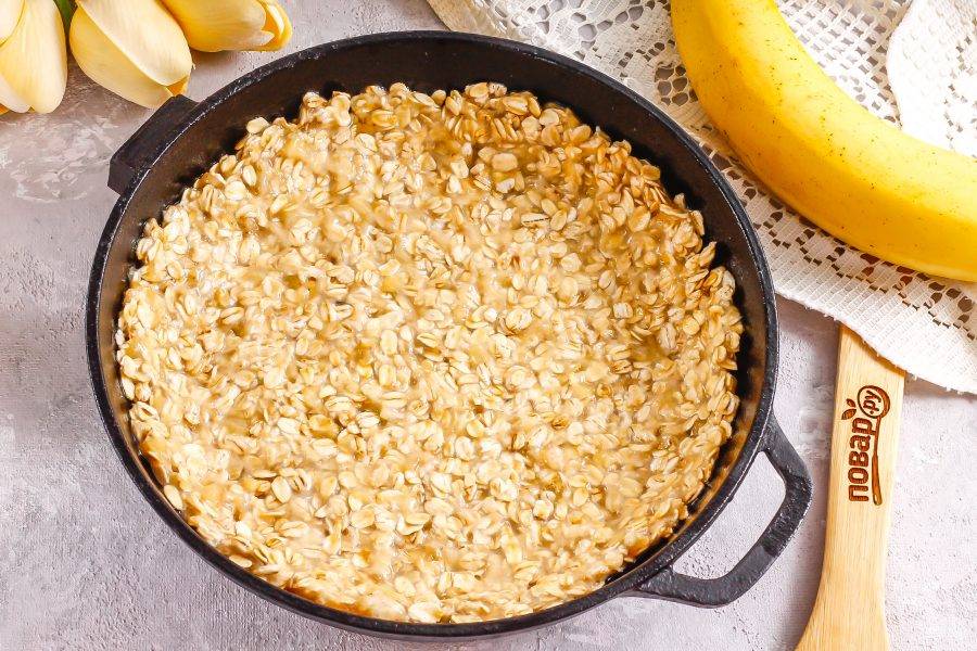 Распределите овсяные хлопья по форме, смазав ее растительным маслом, заходя и на бортики. Разогрейте духовку до 180 градусов.