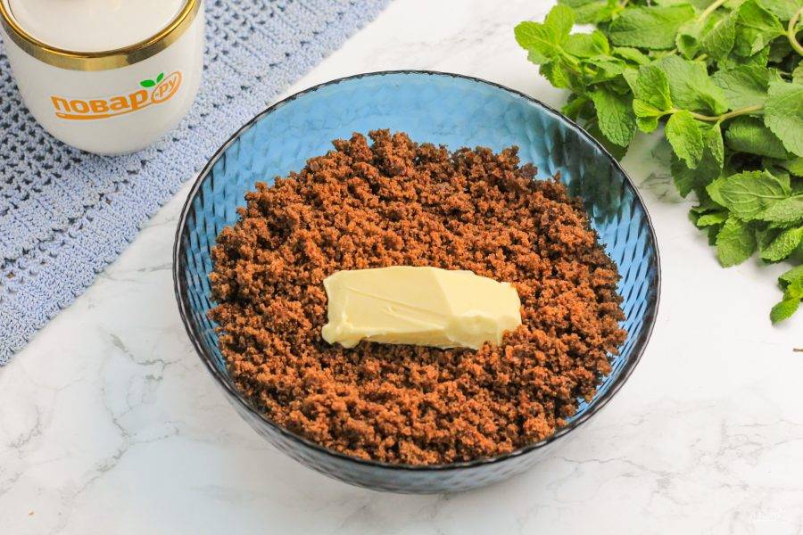 Бисквит или бисквитное печенье раскрошите в глубокой емкости и добавьте размягченное сливочное масло. По желанию его можно растопить в микроволновке. Тщательно вымешайте всю массу.