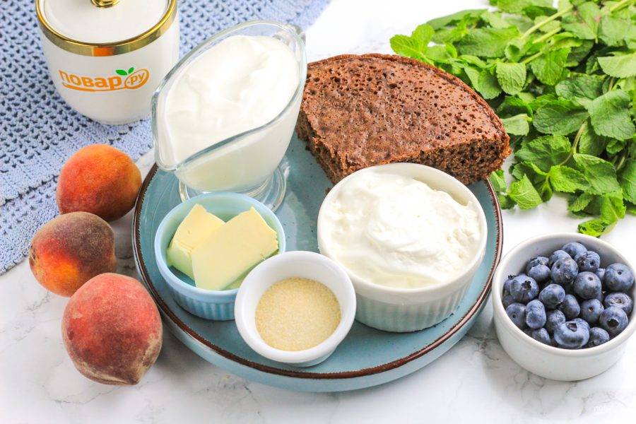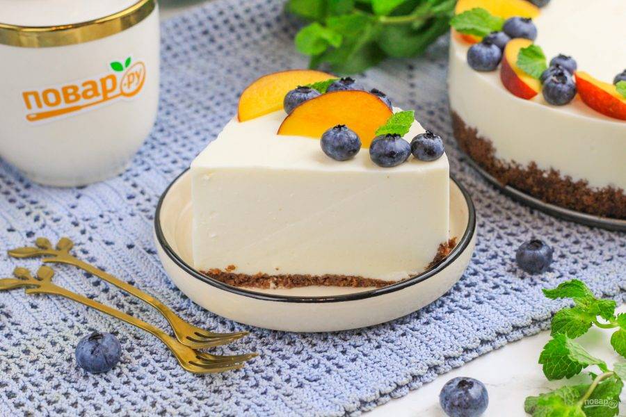 Украсьте его нарезкой персиков и голубикой, листочками свежей мяты.
