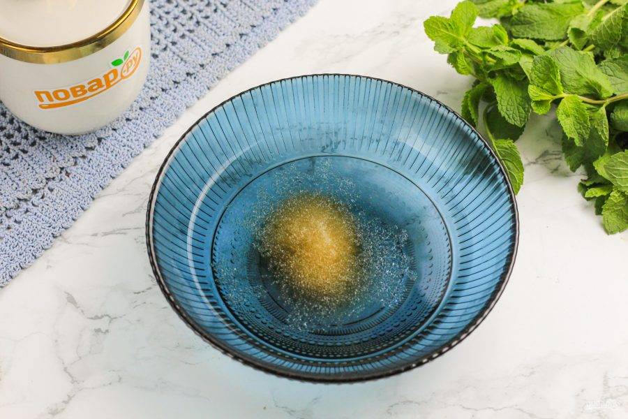 Замочите желатин в горячей воде и оставьте на 5 минут. Затем перемешайте, поднимая его со дна емкости.
