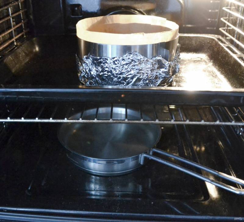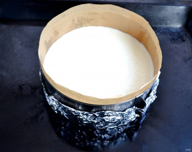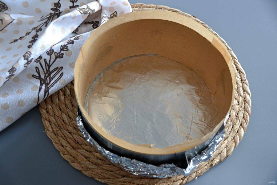 Подготовьте разъемную форму диаметром 18 см. Оберните низ формы двумя слоями фольги, бока простелите бумагой для выпечки. Чтобы бумага хорошо держалась, смажьте бока формы слегка сливочным маслом.