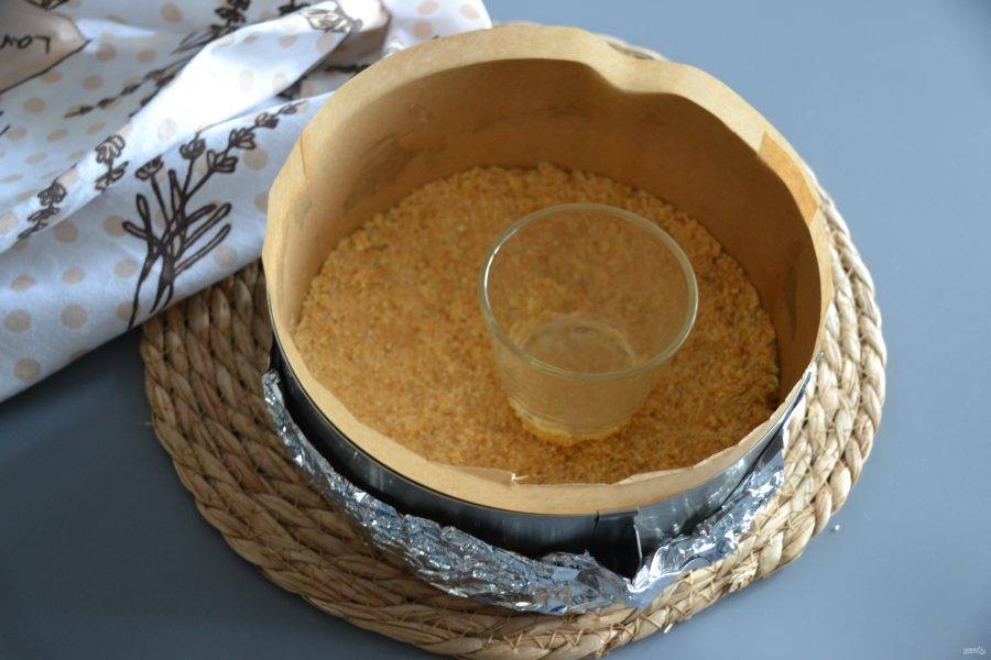 Выложите крошку из печенья в форму, уплотните с помощью стакана. Разогрейте духовку до 200 градусов, подпеките в течение 10 минут.