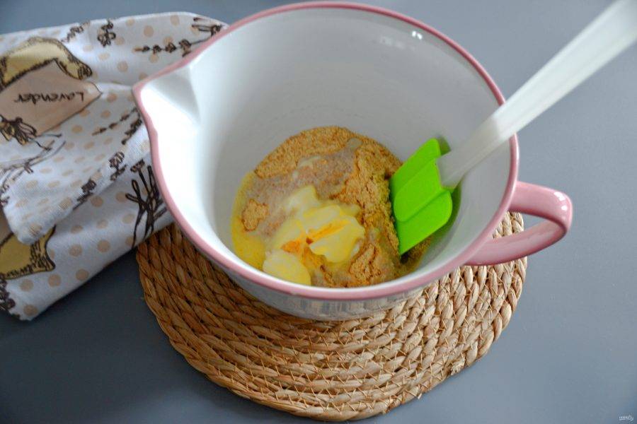 Добавьте в крошку из печенья мягкое сливочное масло и смешайте в однородную массу.