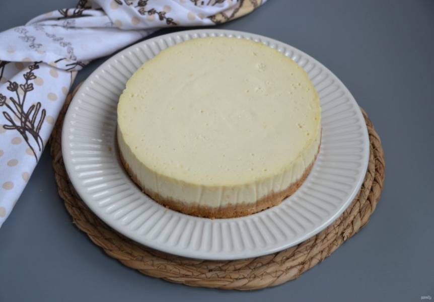 Готовый чизкейк сначала будет слегка подрагивать, но после остывания масса стабилизируется. Охладите чизкейк в течение 1,5-2х часов прямо в духовке, слегка приоткрыв ее. Это позволит избежать трещинок на поверхности. Затем извлеките чизкейк из формы и поставьте в холодильник не менее, чем на 3 часа (можно на ночь) для окончательной стабилизации.
