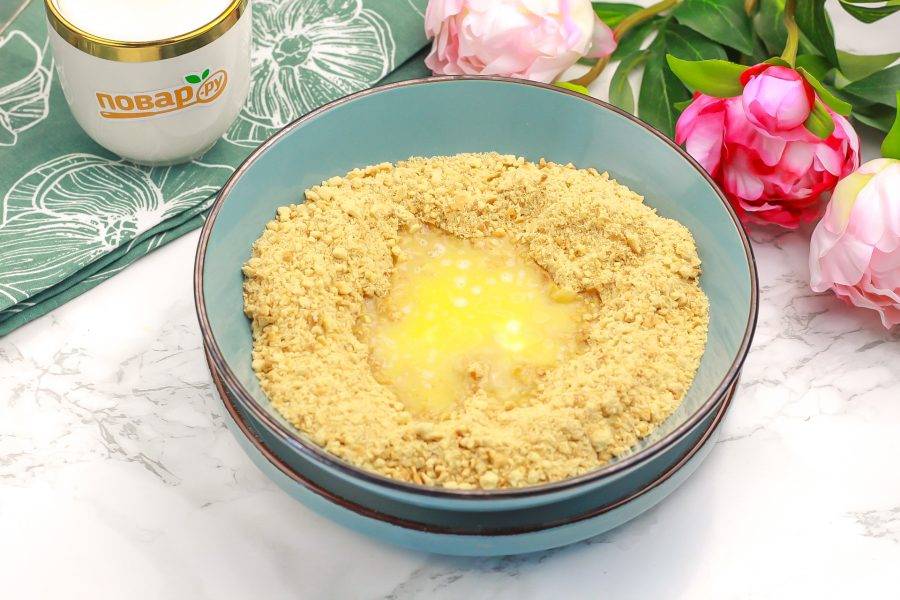Печенье измельчите в кухонном комбайне и залейте растопленным сливочным маслом. Тщательно перемешайте всю массу.