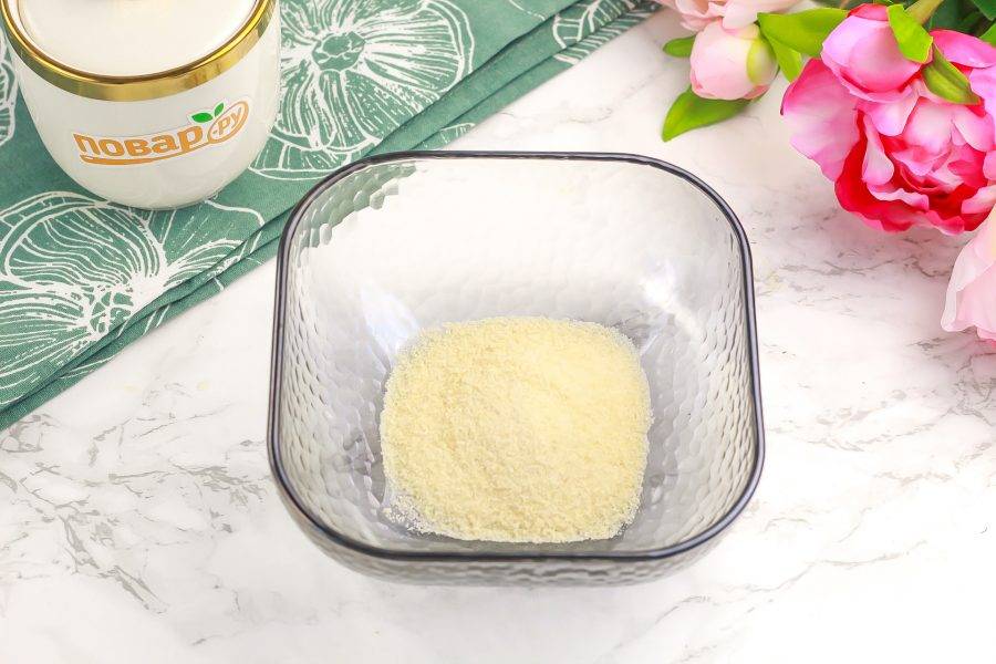 Желатин высыпьте в глубокую пиалу и залейте горячей водой. Тщательно размешайте и оставьте на 10 минут для набухания.