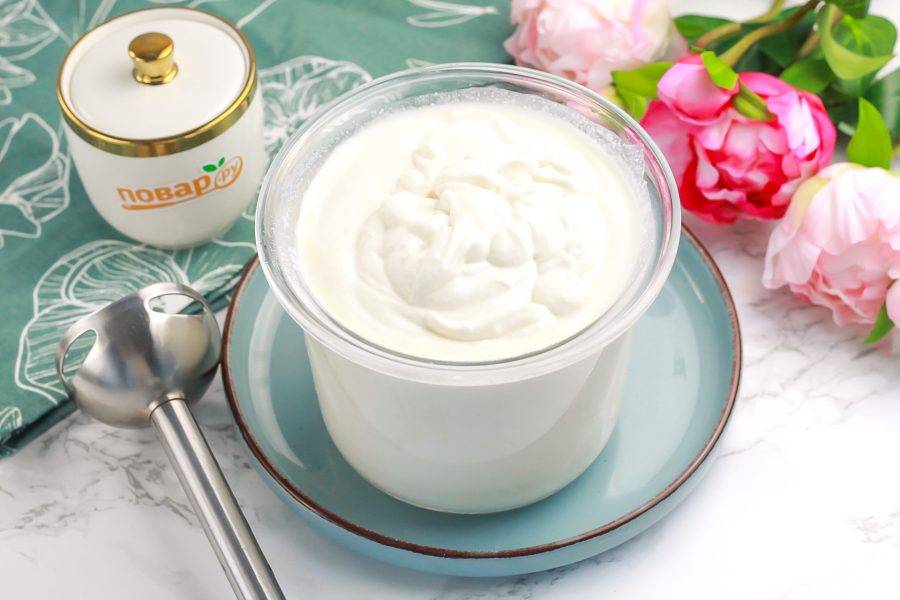 Тщательно перемешайте набухший желатин, чтобы он полностью растворился. Влейте в емкость к творогу и отпюрируйте погружным блендером не менее 5-8 минут. Очень важно измельчить все ингредиенты.