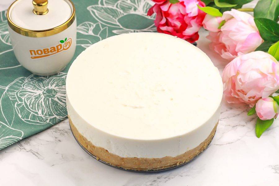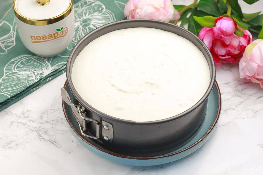Залейте в форму творожную массу и стукните несколько раз об стол ею, чтобы вышли пузырьки воздуха. Поместите форму в холодильник минимум на 4 часа, а лучше — на ночь.