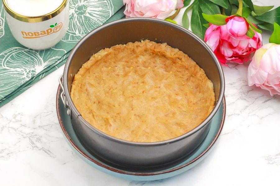 Выложите ее на дно формы для чизкейка и тщательно утрамбуйте, заходя и на бортики.