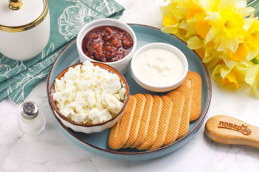 Подготовьте указанные продукты. Творог выбирайте жирный, влажный, чтобы творожный слой таял во рту при дегустации.