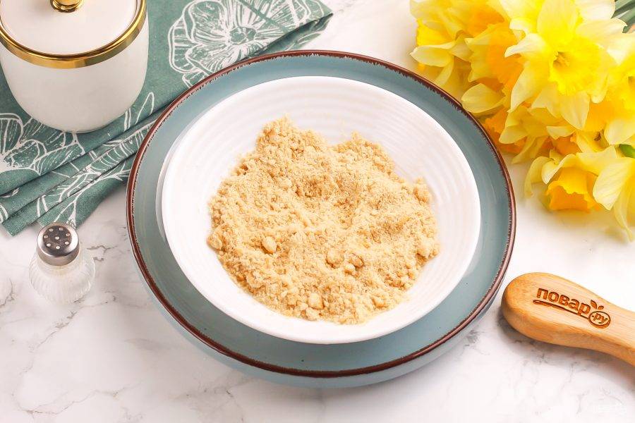 Печенье измельчите в крошку. Если оно не песочное, а бисквитное или слоеное, то добавьте немного сиропа или растопленного сливочного масла, чтобы основа чизкейка была более мягкой.