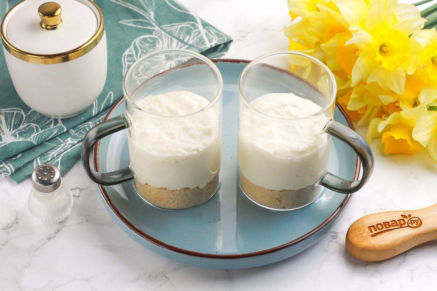 Высыпьте крошку печенья в чашки, стаканы или креманки и пару раз стукните емкостью об стол, чтобы крошка "уселась".