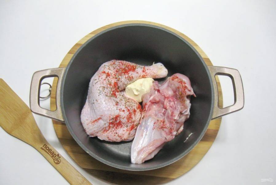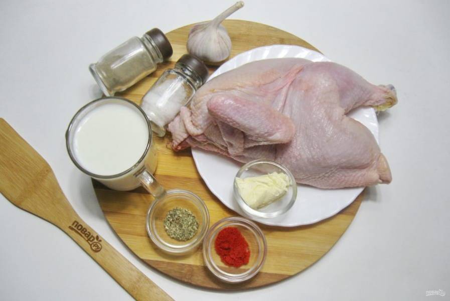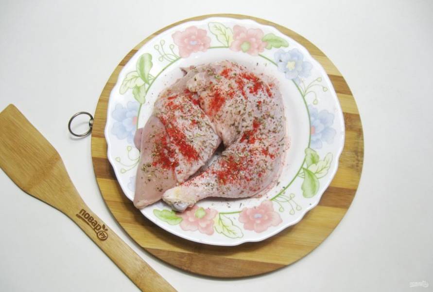 Я взяла половину большой курицы. Птицу помойте, обсушите бумажным полотенцем. Приправьте солью, красным сладким молотым перцем, черным молотым перцем, сушеным базиликом снаружи и внутри. Маринуйте курицу в специях минимум 30 минут.