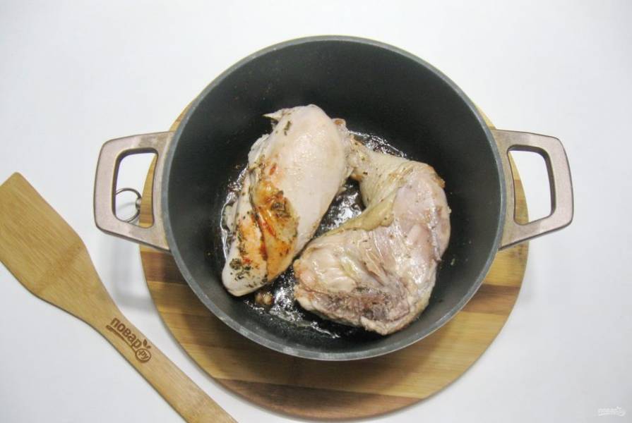 Обжарьте курицу со всех сторон до золотистой корочки.