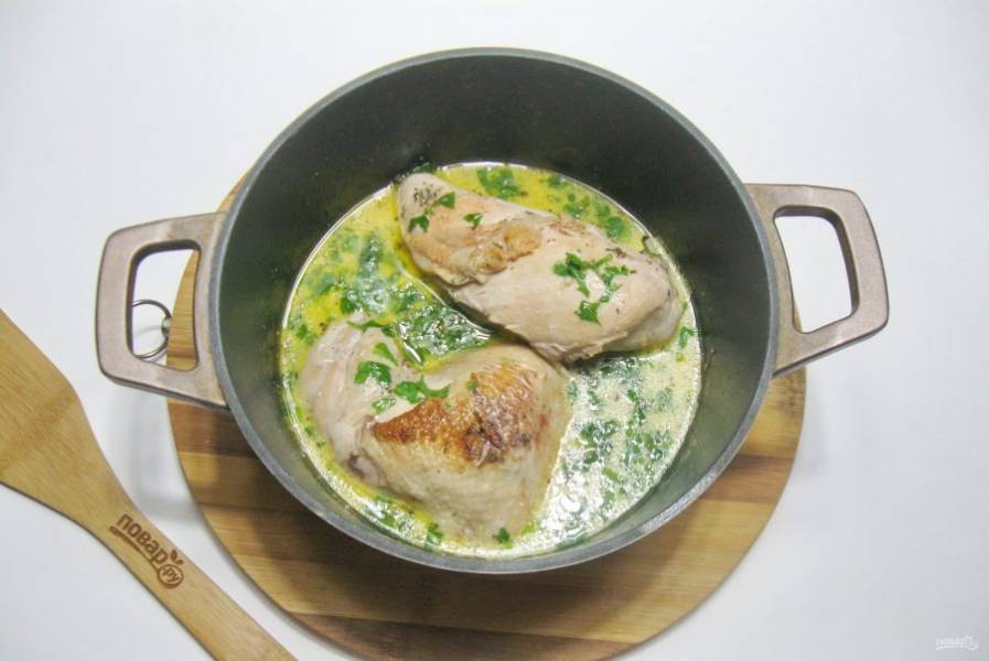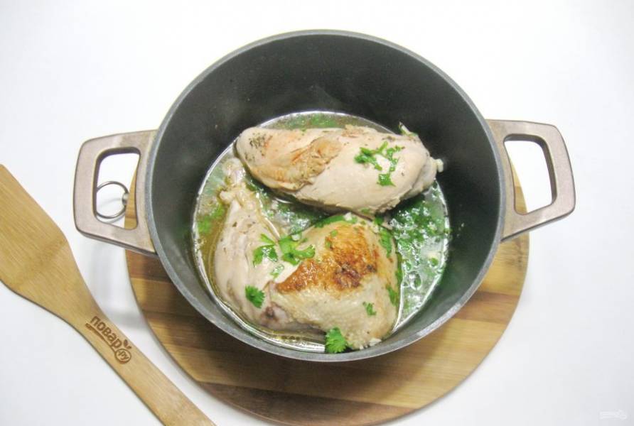 Налейте 100-150 мл. воды. Добавьте чеснок и петрушку. Накройте казан крышкой и тушите курицу на небольшом огне 20-25 минут до готовности.