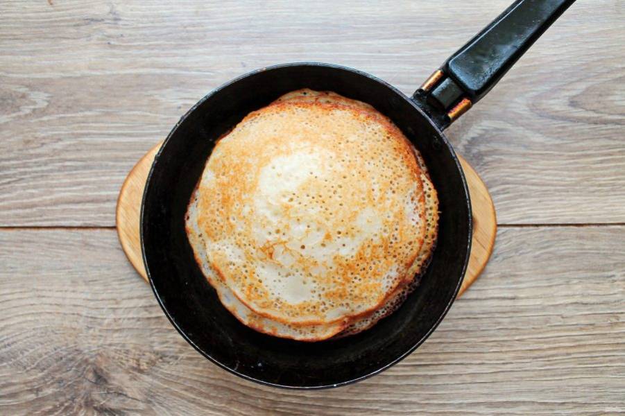Сковороду разогрейте на медленном огне, смажьте маслом и налейте тесто, тонко распределяя по всей поверхности. Выпекайте с двух сторон до золотистой корочки, примерно 1-2 минуты.