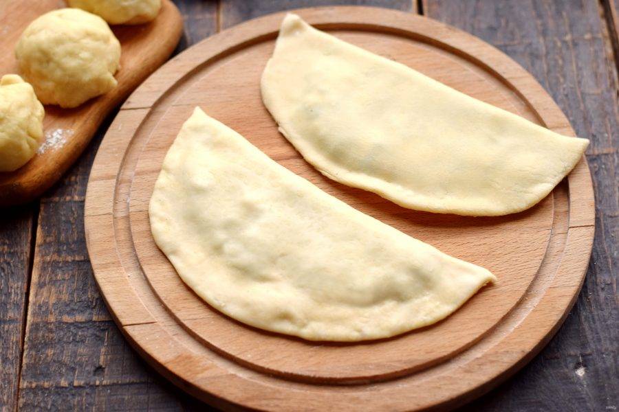 Дощечку слегка присыпьте мукой. Каждый шарик раскатайте с помощью скалки в максимально тонкий пласт круглой формы.