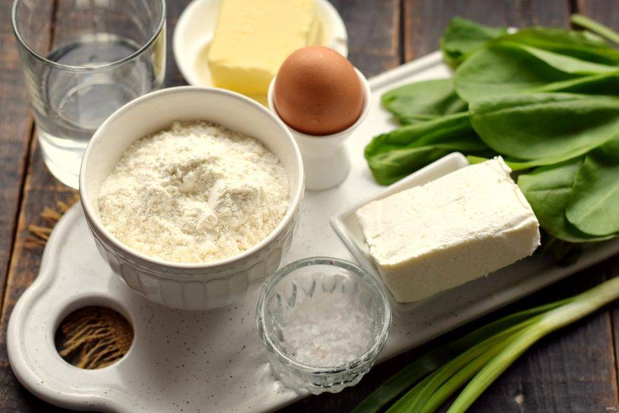 Шпинат и зеленый лук ополосните, высушите. Листья шпината мелко нарежьте, лук нашинкуйте кольцами. К зелени добавьте зернистый творог, вбейте одно яйцо, всыпьте молотый перец и соль.