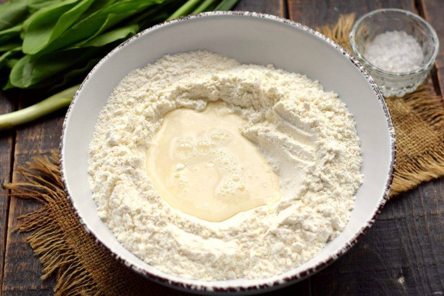 Муку просейте через сито, всыпьте в глубокую емкость, сделайте в середине углубление, влейте теплую воду, добавьте соль.