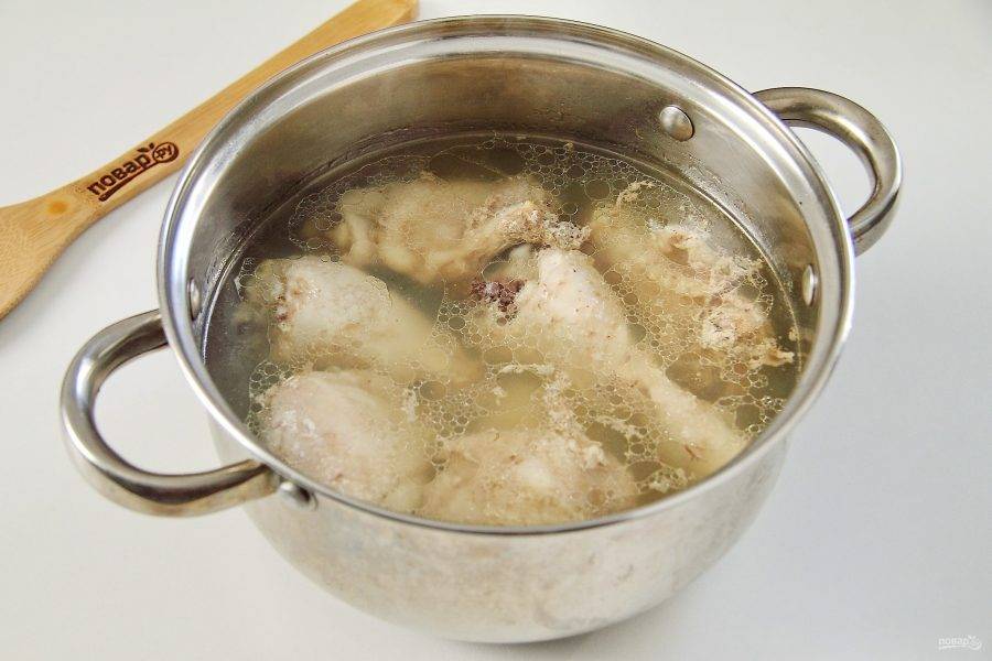Первым делом приготовим курицу, ведь нам понадобится куриный бульон. По желанию нарежьте ее на порционные куски и отварите в подсоленной воде практически до готовности.