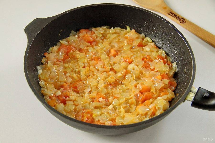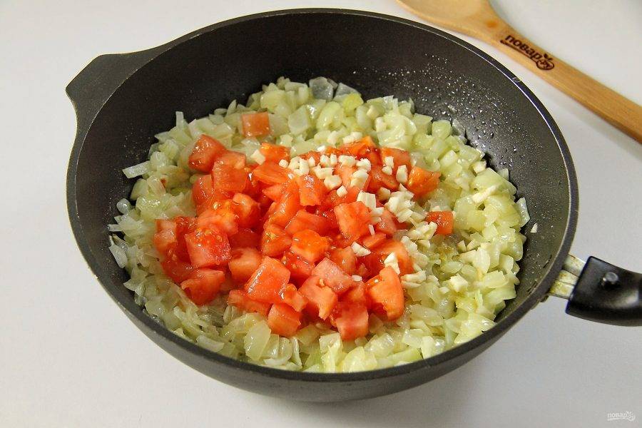 Добавьте нарезанный кубиками помидор и чеснок. У помидора предварительно снимите шкурку, сделав для этого на плодоножке крестообразный надрез и подержав в кипятке 1 минуту.