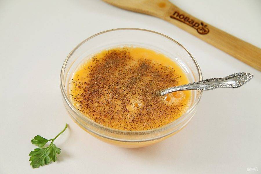 Затем взбейте яйца, добавив по вкусу соль и перец.