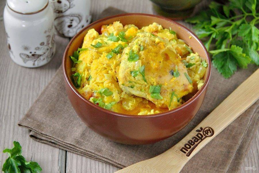 В результате получается нежная и сочная курочка в воздушном яично-луковом суфле, по вкусу напоминающим омлет, но с более ярким и насыщенным вкусом. Приятного аппетита!