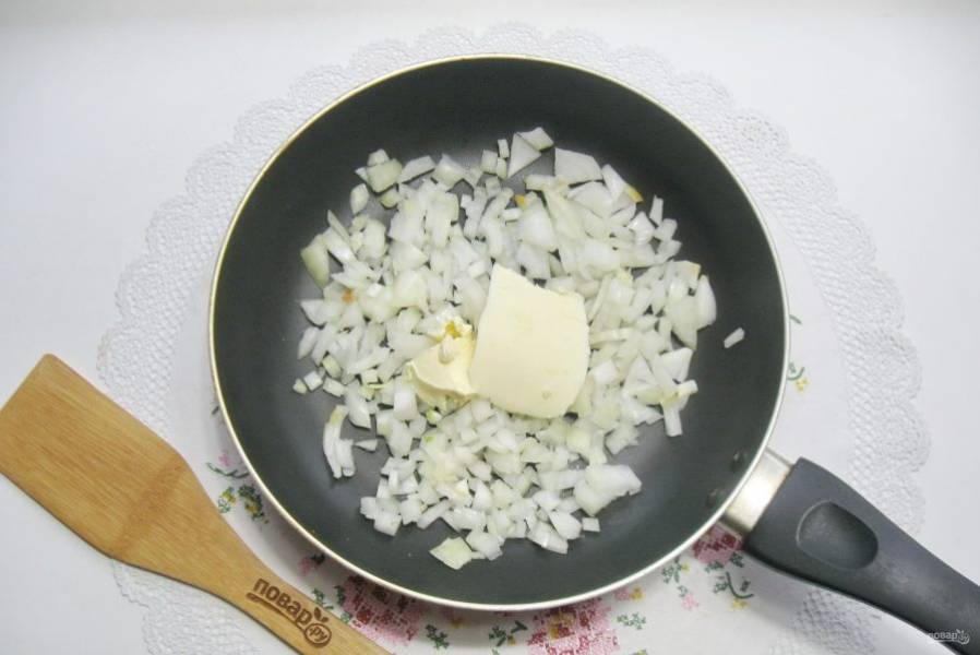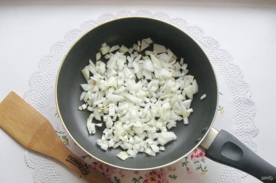 Лук очистите, помойте и мелко нарежьте. Выложите в сковороду.