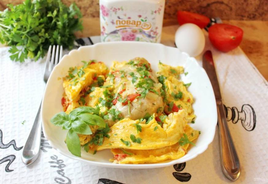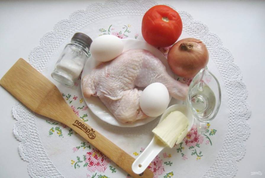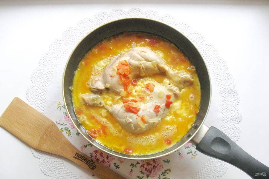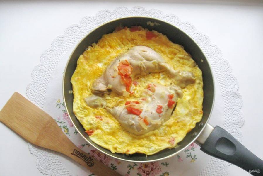 Яйцами залейте курицу с луком и помидором.