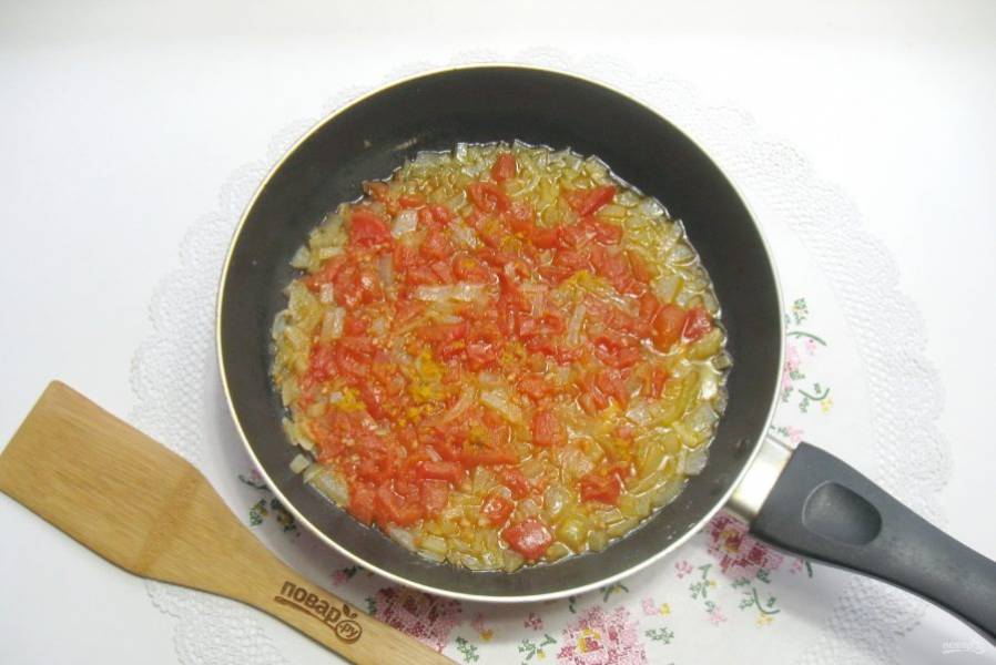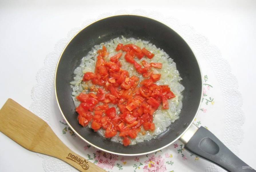 Крупный помидор очистите от кожицы и мелко нарежьте. Выложите в сковороду к луку.