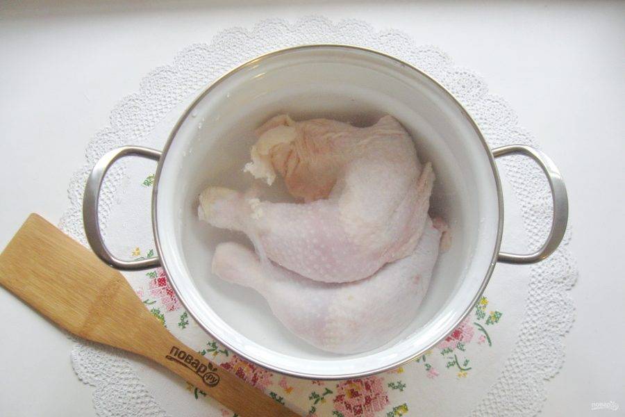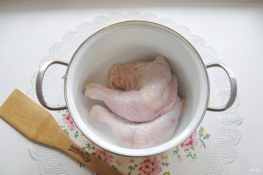 Любые мясистые части курицы помойте и выложите в кастрюлю.