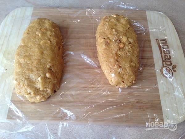 4. Делим тесто на две части, формируем батончики шириной примерно 4 см. Заворачиваем в пищевую пленку и отправляем в холодильник минут на 30.