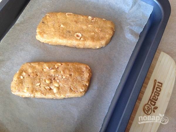 5. Противень застилаем пергаментом, выкладываем батончики теста. Подровняем, я сразу делаю края немного наискосок, ведь кантуччи будут нарезаться именно наискосок.