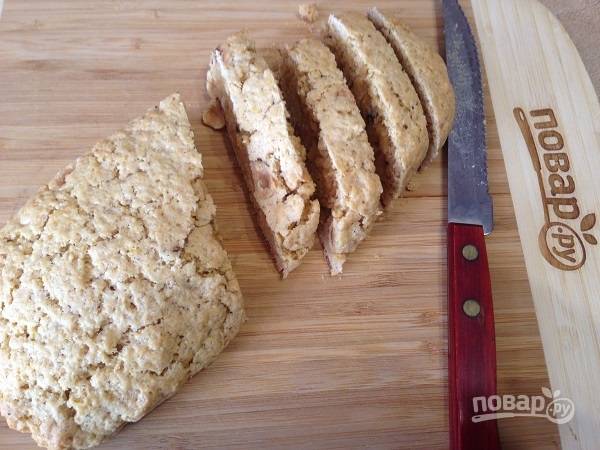 7. Затем нарезаем острым ножом наискосок на кусочки толщиной 1 см.