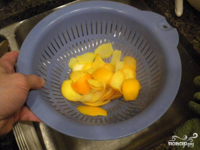 2. Положить кожуру в кастрюлю и залить холодной водой. Довести до кипения, снять с огня и процедить. Повторить этот шаг еще два раза, каждый раз используя свежую воду.