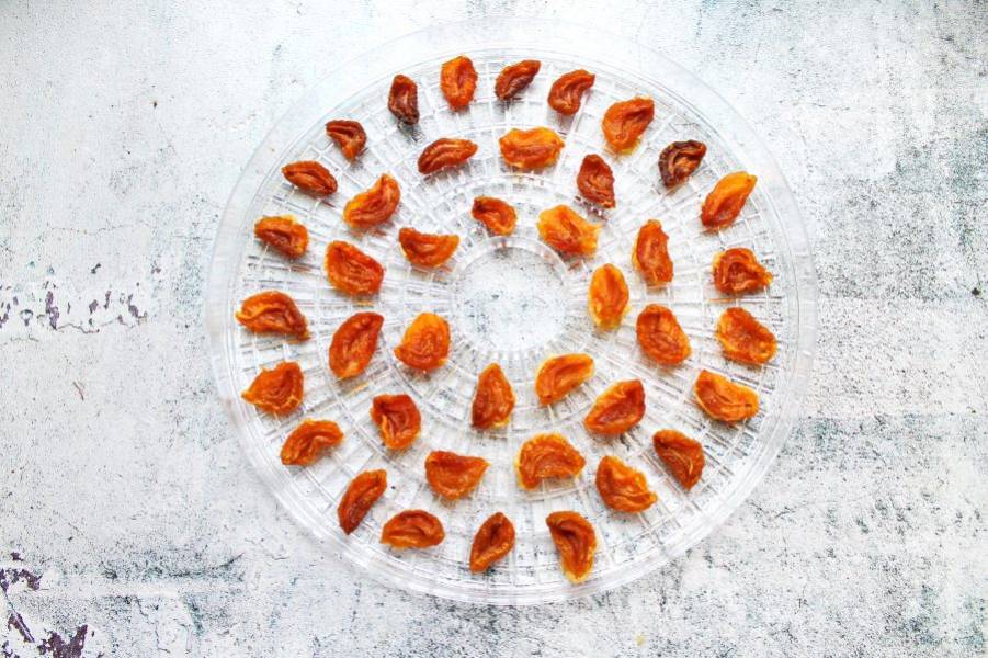 Установите сетки с подготовленными дольками абрикосов в сушилку и сушите в течение 8-12 часов до готовности.