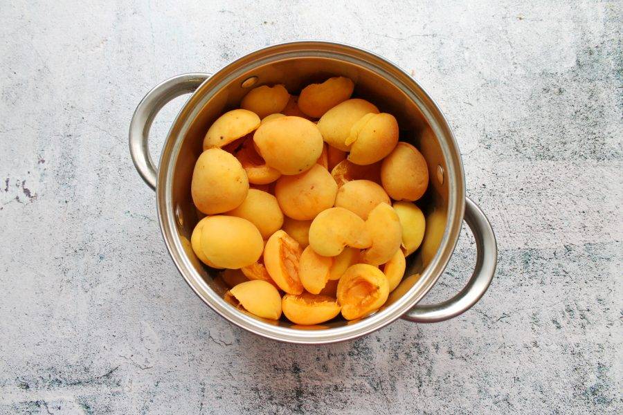 Абрикосы переберите, вымойте и удалите косточки. Выложите половинки в кастрюлю с толстым дном.